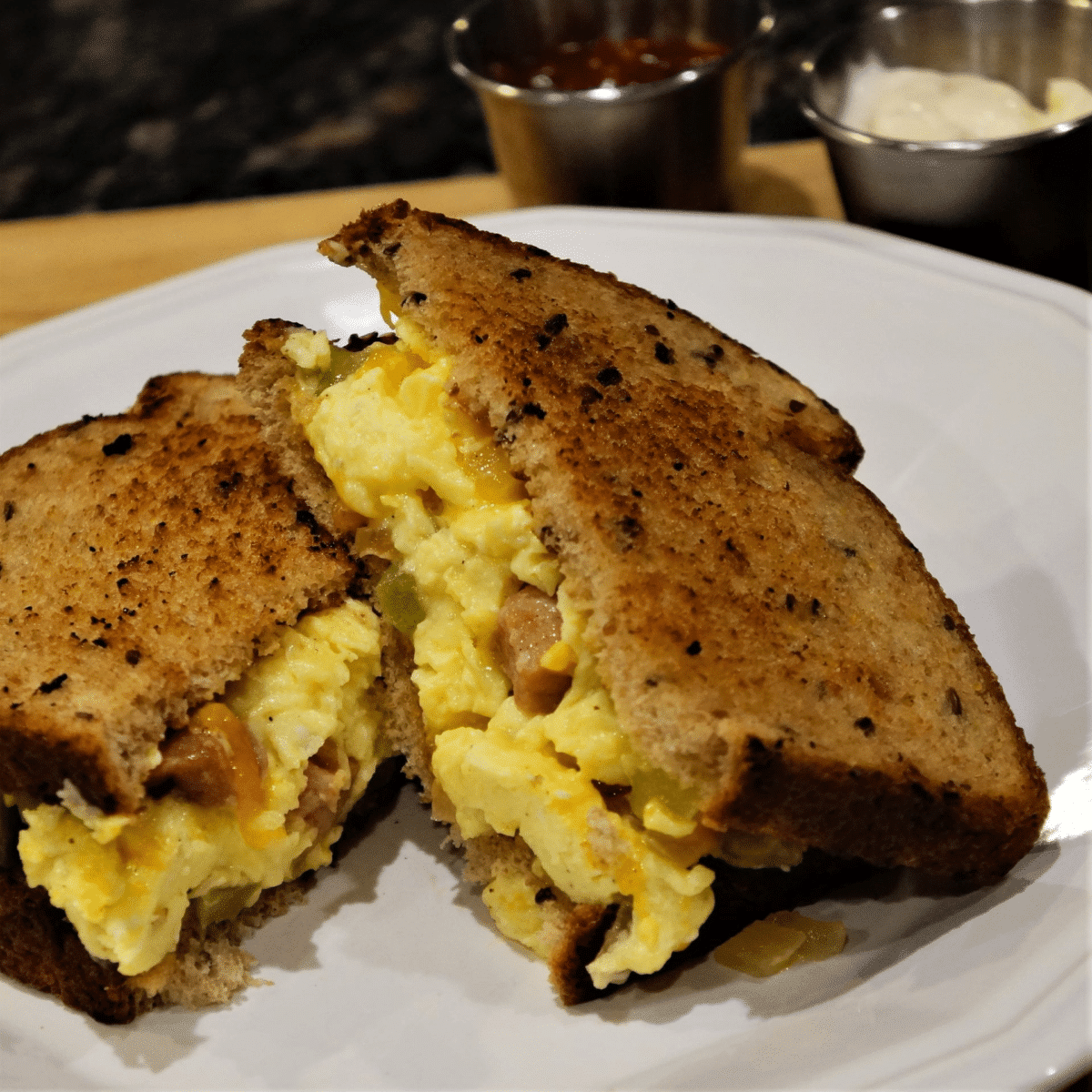 It is also known as the Western Sandwich and, of course, its’ omelet cousin. You could just make the omelet version and slap between the bread slices as many people do. I just happen to prefer the scrambled egg version.