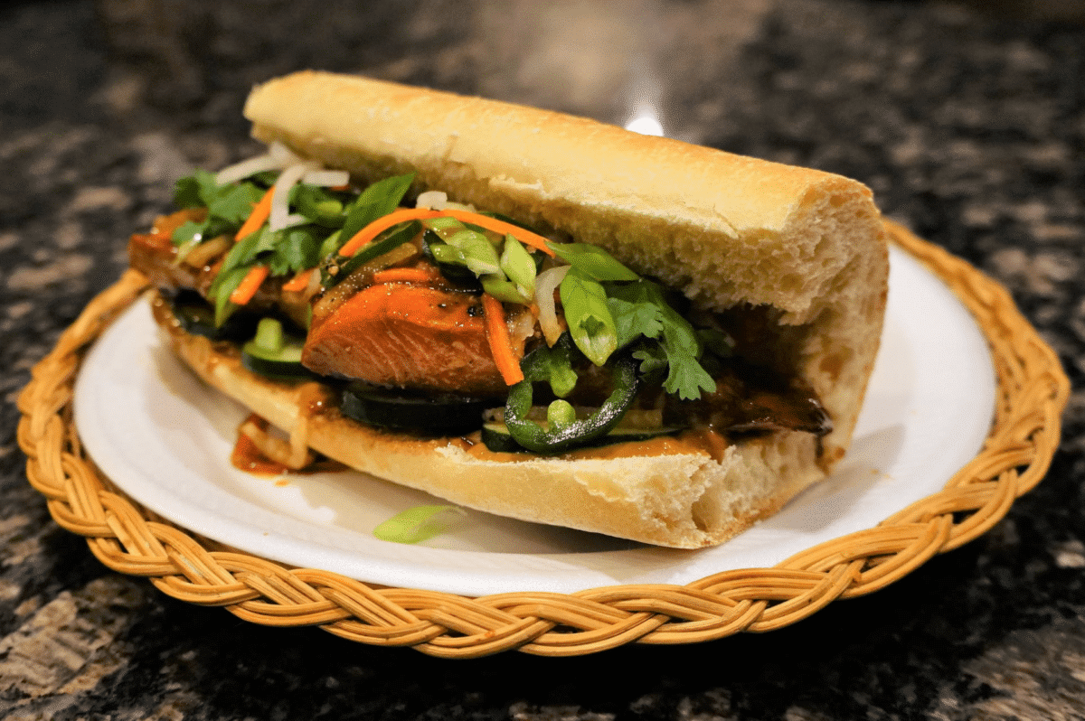 Today I present to you the Salmon Bahn Mi! Washington state’s official sandwich is a salmon sandwich and it’s no wonder since they produce over 10 million pounds of salmon each year with an economic value of over $40 million. I found a way to combine the official state sandwich with another sandwich that has found it’s way into the hearts and stomachs of Washingtonians. The Bahn Mi.