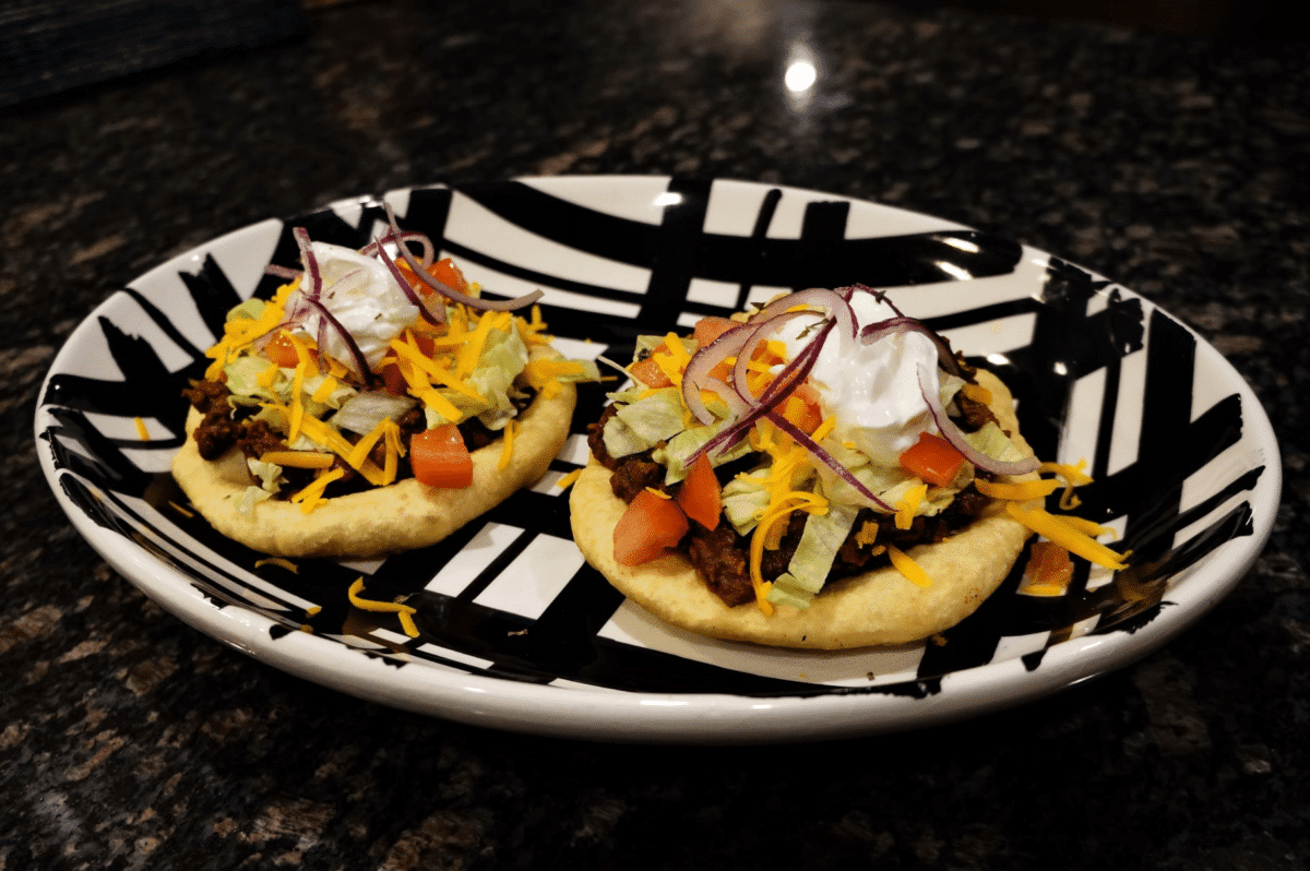 I’ve never made fry bread before so I was excited to try this one. It’s actually quite easy, kind of like stretching out a pizza and frying it. The toppings are the usual taco seasoned ground beef with pinto beans, shredded lettuce, diced tomatoes, grated cheddar, a dollop of sour cream and shaved red onion. You can also make a sweet dessert with drizzled honey and confectioner’s sugar.