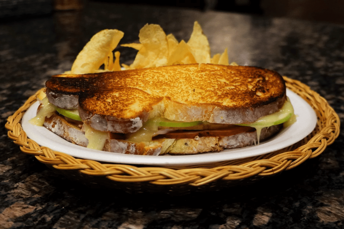 Today I present to you the Vermonter! When the name of the sandwich is the same as the demonym for the people of Vermont you know you have a winner! It’s chock full of locally sourced ingredients which was the intent of the cook that invented it: Jason Maroney, the cook and waiter of a Bar and Restaurant in Burlington, VT. There is a basic formula for the original that consists of meat (turkey, ham, sausage), fresh apple slices, Vermont extra sharp white cheddar and any sweet enriched bread plus a topping ranging from spiced apple butter to maple-mustard.