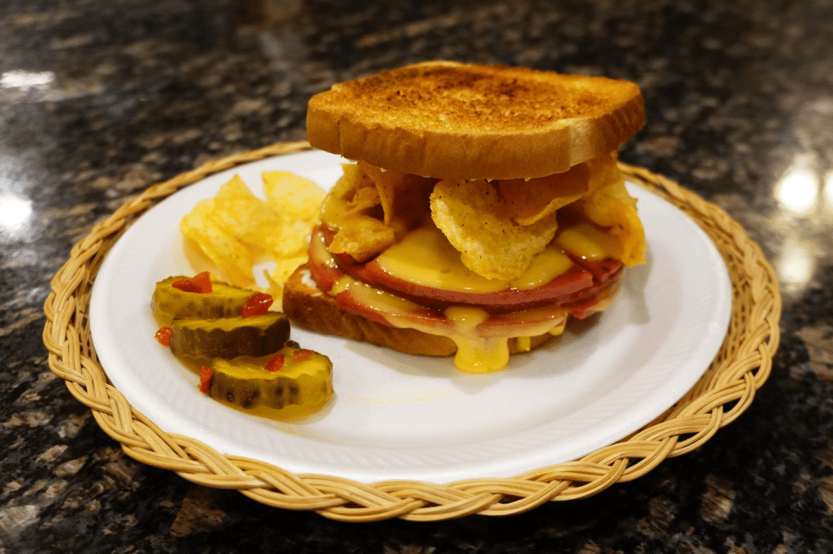 My Granny only used one thick slice for us kids and she never toasted the plain white bread popular here in Texas. We also put plain potato chips in ourselves, not the kettle chips used here since they didn’t exist yet. Everything else is the same.