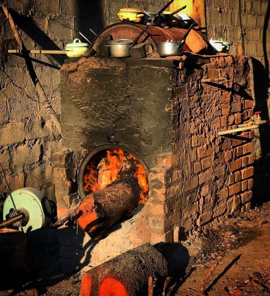 Today, I have access to an mbaula and a wood-fired oven. Our farm workshop—the beating heart of our commercial farm where aging equipment is kept running; where mechanics, welders, carpenters and builders create and improvise—constructed the wood-fired oven for me on one side of a donkey boiler. Built atop a circle of fire, a donkey boiler is an enclosed drum in which water running in and out is heated for our kitchen and bathrooms.