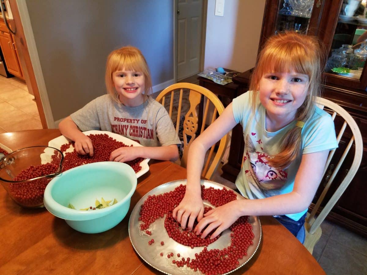 Choose shrubs that get a lot of morning sun, they tend to be more flavorful. Shrubs in the woods which don’t get much sun tend to produce only a few berries, so look in sunny areas and you’ll find bushes literally laden down with pounds and pounds of fruit! I like to have a bag or bucket underneath a branch to catch the shower of drupes as I run my fingers down the twigs. Be careful, though – about half of the twigs have a sharp spine on them here or there so run your fingers down with care! After harvesting you will notice you have picked up a bunch of leaves, twigs, and even some ladybugs in your bucket. We spread our berries out on trays and pluck out all the debris. My girls love finding the ladybugs!