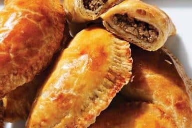 Beef empanadas, also known as pati, are made of flour or (hominy) corn. The dough is rolled out thin, cut into round disks, and folded in half in the shape of half-moons. They are usually filled with red or white meat, fish, cheese, or vegetables. They can be baked (as these are) or fried. The crust usually contains some fat, oil, or butter to make it flaky. Empanadas are a traditional dish in Panama, and they are eaten year-round and at any time of day.