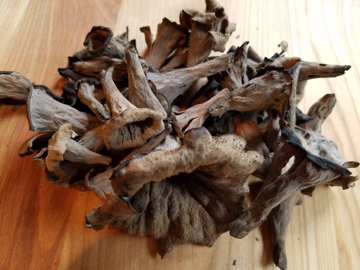 If you should happen upon some Horn of Plenty you’ll be happy to know they will keep appearing in the same spot, year after year. I return to the same oak forest every year, to a mossy area around a rotted tree stump. Sometimes there are trumpets, sometimes only chants, but I’m seldom disappointed with either. When found, cut Black Trumpets at the base of their funnel instead of pulling them up out of the soil — this will keep dirt at a minimum and make cleaning easier. Black Trumpets dehydrate and rehydrate very well. You can even sun-dry them if you don’t have a dehydrator.