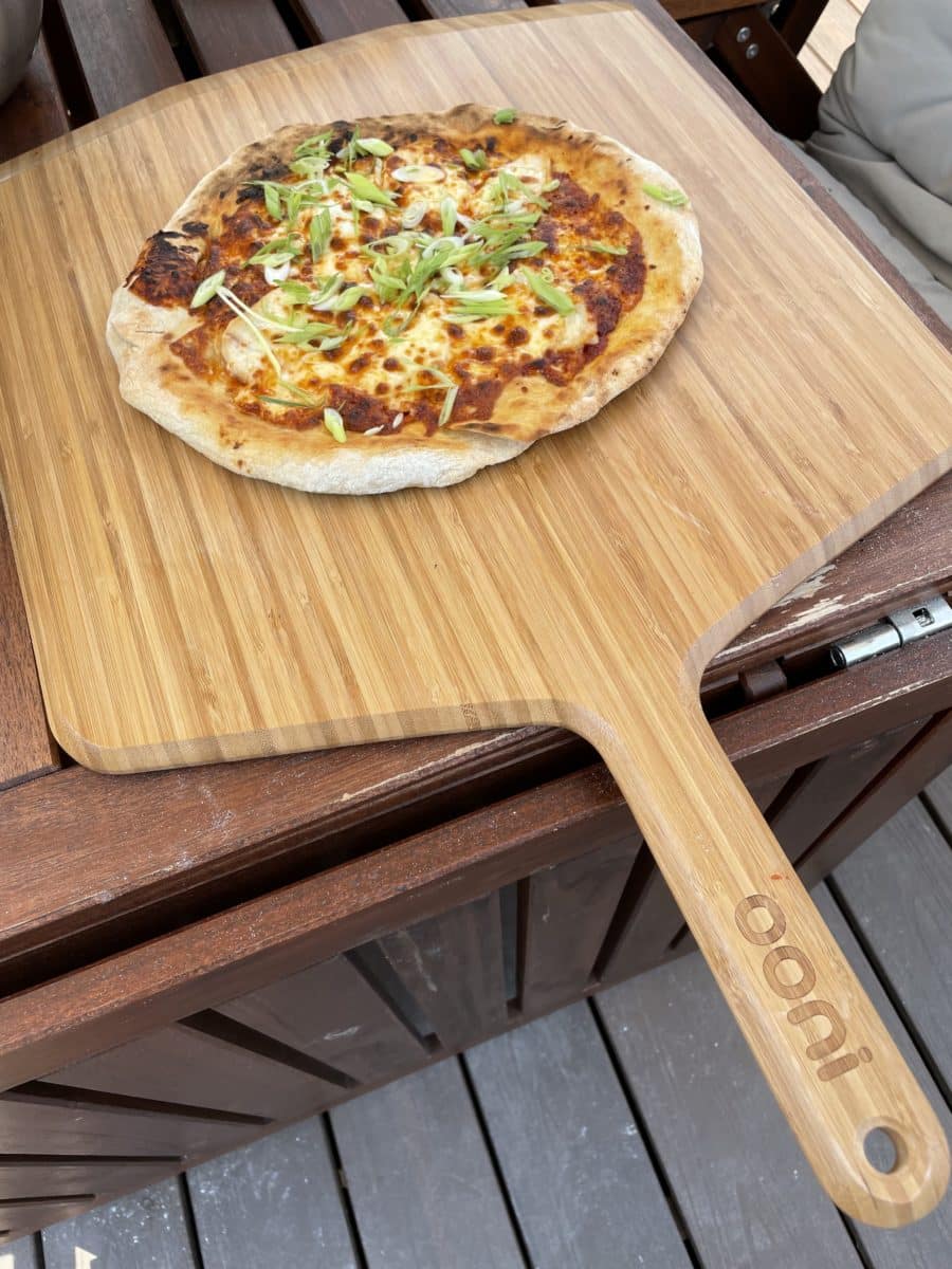 Remove pizza using Ooni pizza peel and place on a cutting board, or a wooden Ooni pizza peel. Cover pizza generously with sliced scallions and slice and serve immediately.