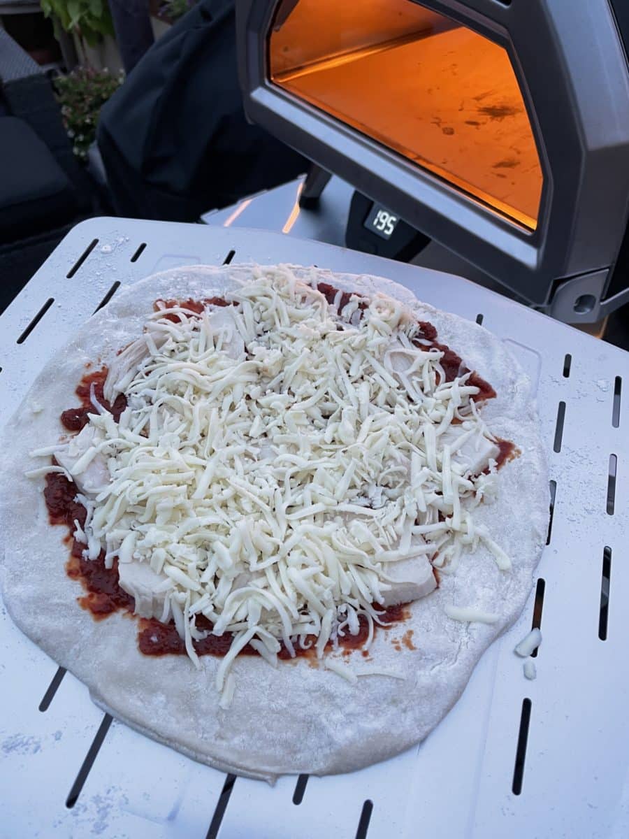 When oven is preheated, generously flour your Ooni pizza peel and, working quickly, stretch dough on it. Spread dough with desired amount of sauce. Layer generously with shredded chicken and cover with shredded cheese. Launch pizza into oven and position in the back-center. Rotate pizza using Ooni pizza turning peel to ensure even browning. Keep in mind: depending on your desired oven temperature, your pizza may cook to completion in between 1-2 minutes!