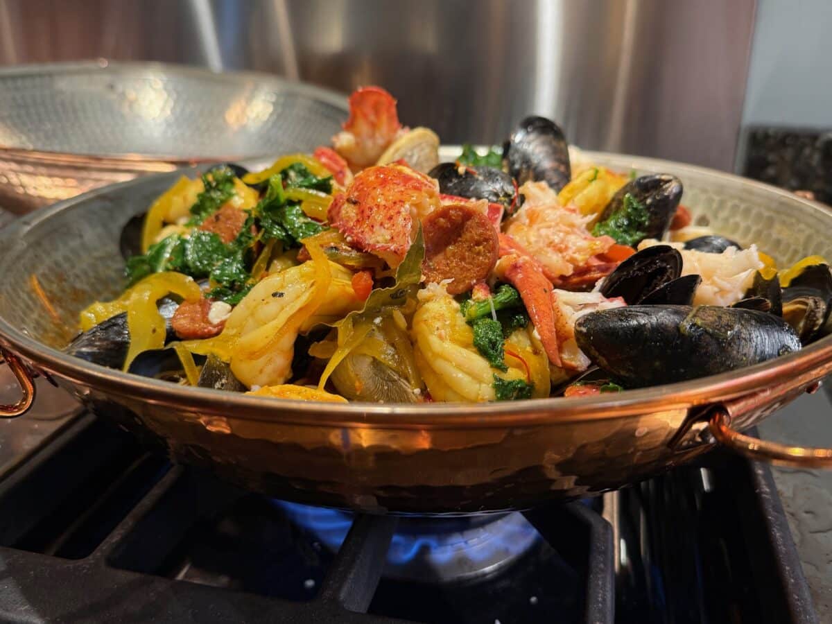 Add the clams and simmer for 2-3 minutes. Add the shrimp and mussels and cover. Simmer for 5-7 minutes or until the clams and mussels have opened fully. Discard any that remain closed. Add the kale and lobster pieces, if using. Stir until the kale is just wilted and still bright green, about 30 seconds.
