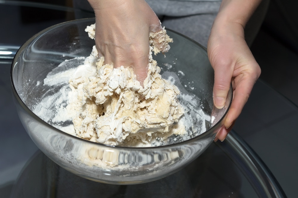 A detailed view of hands thoroughly mixing dough inside a clear bowl. The texture of the dough suggests it’s well combined but still a bit sticky.