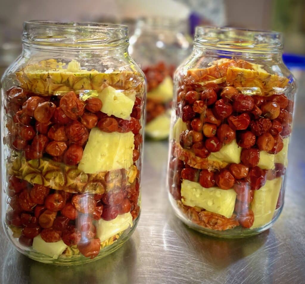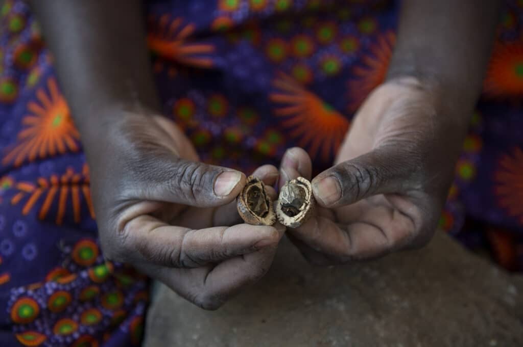 I ferment sindambi (wild hibiscus), mungomba, (wild sourplum), musika (tamarind), and muchingachinga (northern dwaba berry) into tepache and vinegar. And I sometimes combine them with organic fruits and roots, like strawberries, pomegranates, ginger and turmeric, grown in my garden. I turn all these (mostly bright red) wild fruits into jellies, jams, glazes, ice cream and liqueurs, while the dried powder of the baobab fruit adds a je ne sais quoi to baked goods and drinks. Contained in a velvet-skinned pod the size of a lady’s clutch bag, powder-dusted baobab seeds are held together like pieces of a puzzle in a netting of coral pink fibre. Its fragrant powder has the texture of sherbet and is tart, like a lemon. The fat-filled wild mongongo nuts are not only terrific for feeding vegans as they make rich mayonnaises and sauces, they are a great substitute for overpriced imported nuts. Our house is constructed beneath the enormous crown of a mongongo tree. Its fruits crash down on to our tin roof every May, like an offering from Mars, the God of War, reminding us (loudly) of the bounty this woodland, if nurtured, will always provide.