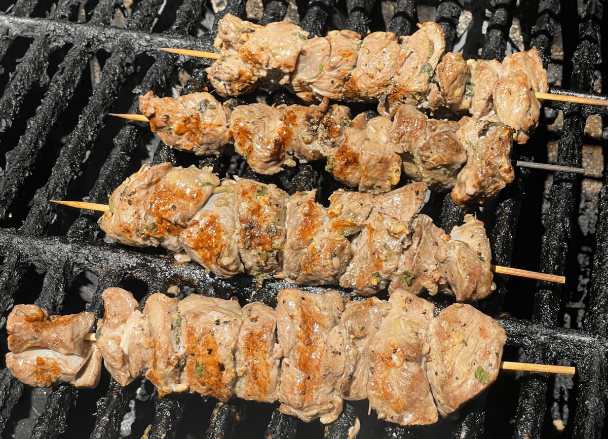 Lamb kebabs with yogurt sauce on a plate outdoors with ptia