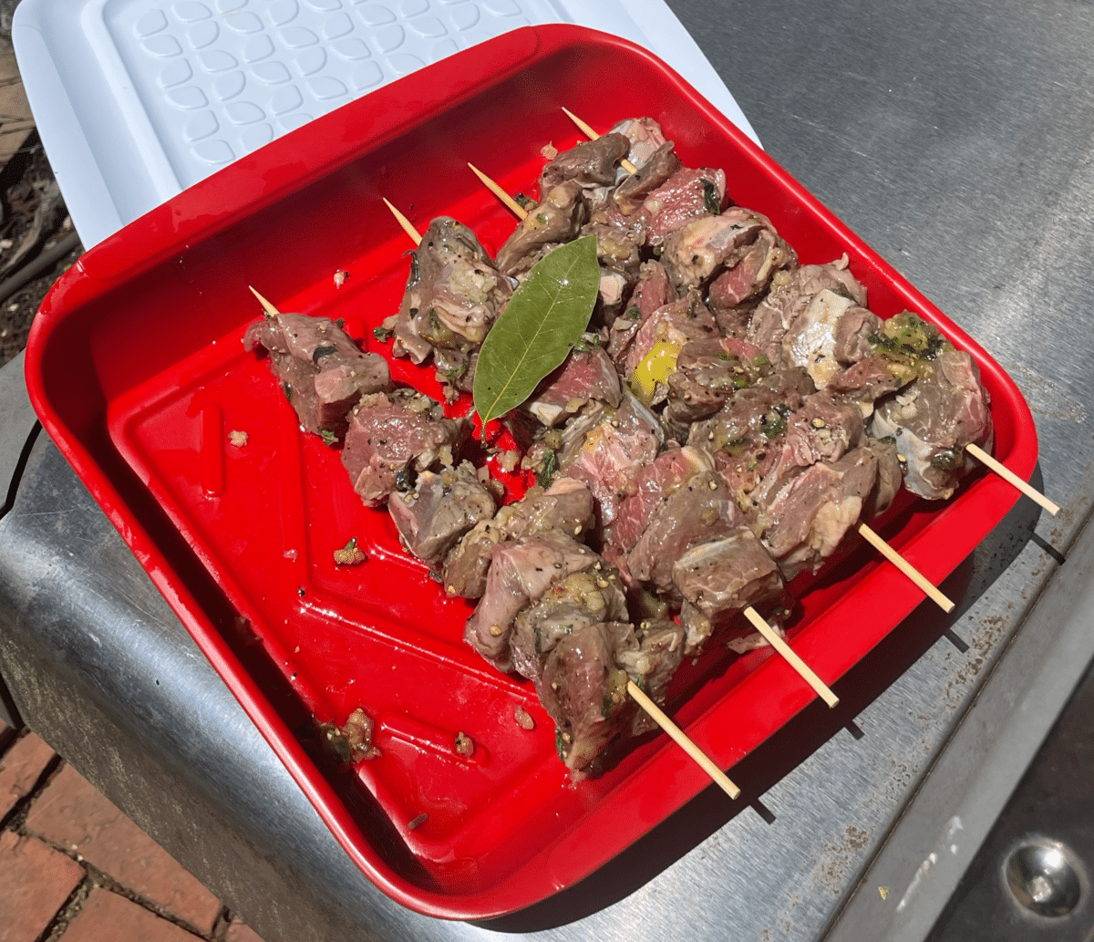 To grill and serve: Preheat a grill. Remove the lamb cubes from the marinade and thread onto 8 or more skewers. Grill the lamb, turning often, until browned on the outside and medium-rare (or to taste) on the inside. Serve with yogurt sauce, tomatoes, lettuce, onion, hummus, and pita bread.
