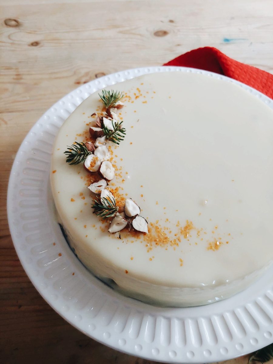 An elegant white chocolate mousse cake garnished with sprigs of pine and sprinkled with hazelnuts.