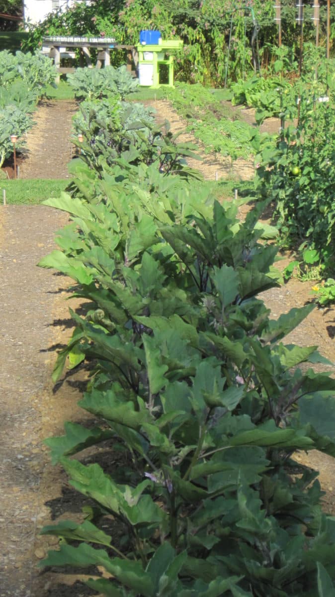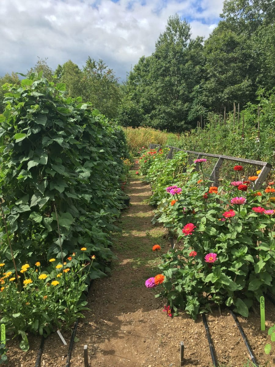 The main garden is in the first field. It has two large sections, each of which is further divided. Within these, I created permanent raised beds of various widths and lengths, separated by paths. When I designed this area, my intention was to make it not only extremely productive but also beautiful. I grow companion and edible flowers at the ends of each growing bed, and also use them to separate different crops or varieties within the beds. I have devoted one large sub-section to a rotation of cutting flowers, including dahlias and sunflowers, and another to growing annual herbs like parsley, cilantro, fennel, dill, and some of the more exotic herbs like shiso. This year, I added a bed for perennial herbs such as oregano, tarragon, thyme, and lavender.