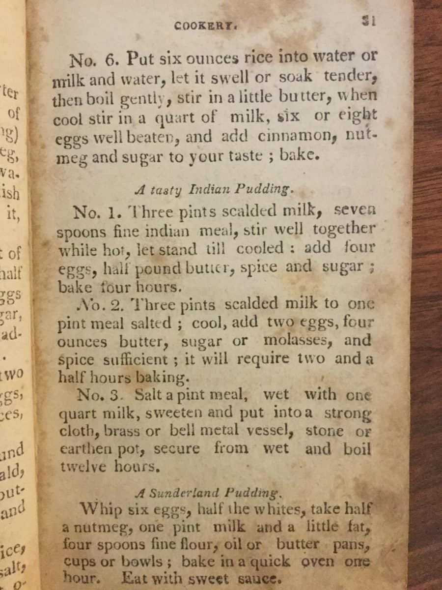 As I was turning the pages of an updated edition, this one reprinted in New York in 1795, I found a pressed four-leaf clover amidst Carter’s monthly menu suggestions for February (she suggests a saddle of roast mutton with pickles and a brain-laced parsley sauce, if you’re curious). I was lucky enough to find Indian Pudding listed in the index. But on the referenced page, the receipt given was for Italian Pudding. An unfortunate typo, for sure.