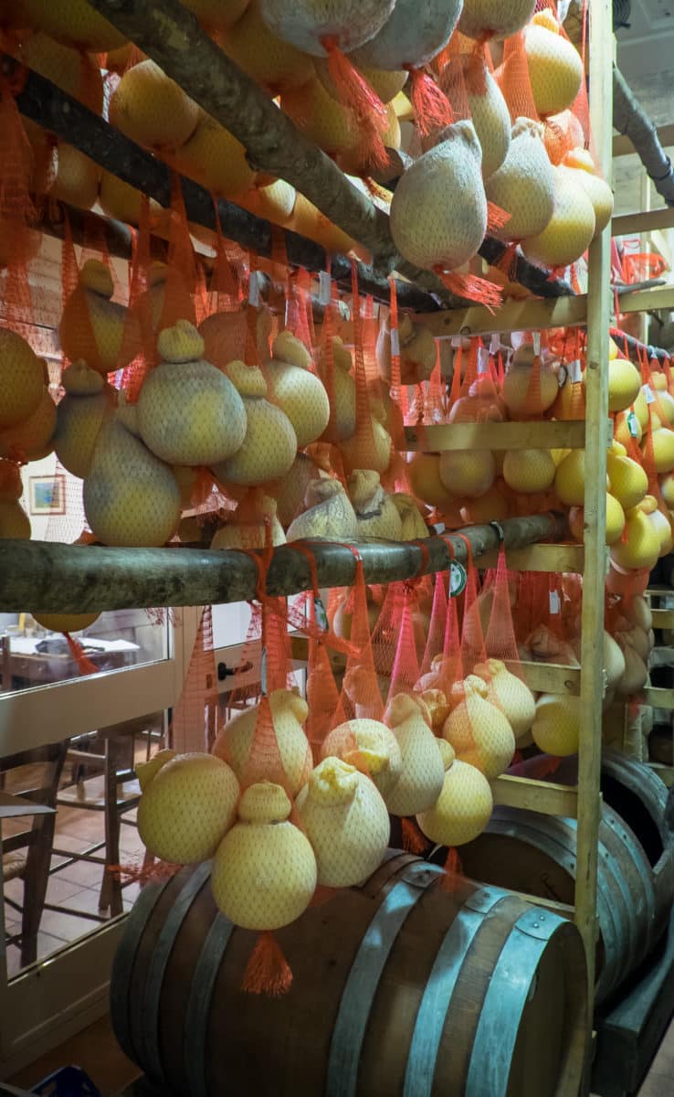 After lunch we were welcomed into the kitchen for a glass of wine and to chat with the expansive Gregorio. The work space bustled with activity, a caldron of their fresh raspberry jam simmered under a cook’s watchful eye. Crates of plum tomatoes and shelling beans still in their pods waited for their turn on the commercial stove. Last, we visited the aging “cave,” a climate- controlled room where, under the bulbous cheeses strung from sawn-off tree boughs, old wooden wine barrels aged Gregorio’s special hard pecorino – delicioso!