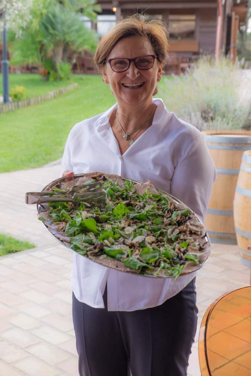 The farm produces several award-winning cheeses, including a creamy brie-like pecorino. Our simple and hearty lunch included a treat new to me – lightly pickled zucchini and summer squash – a lightly crunchy, refreshing complement to the rich salumi and cheese. Here, our pasta course was a giant raviolo filled with fresh herb-flecked ricotta that we cut into portions at the table for serving.