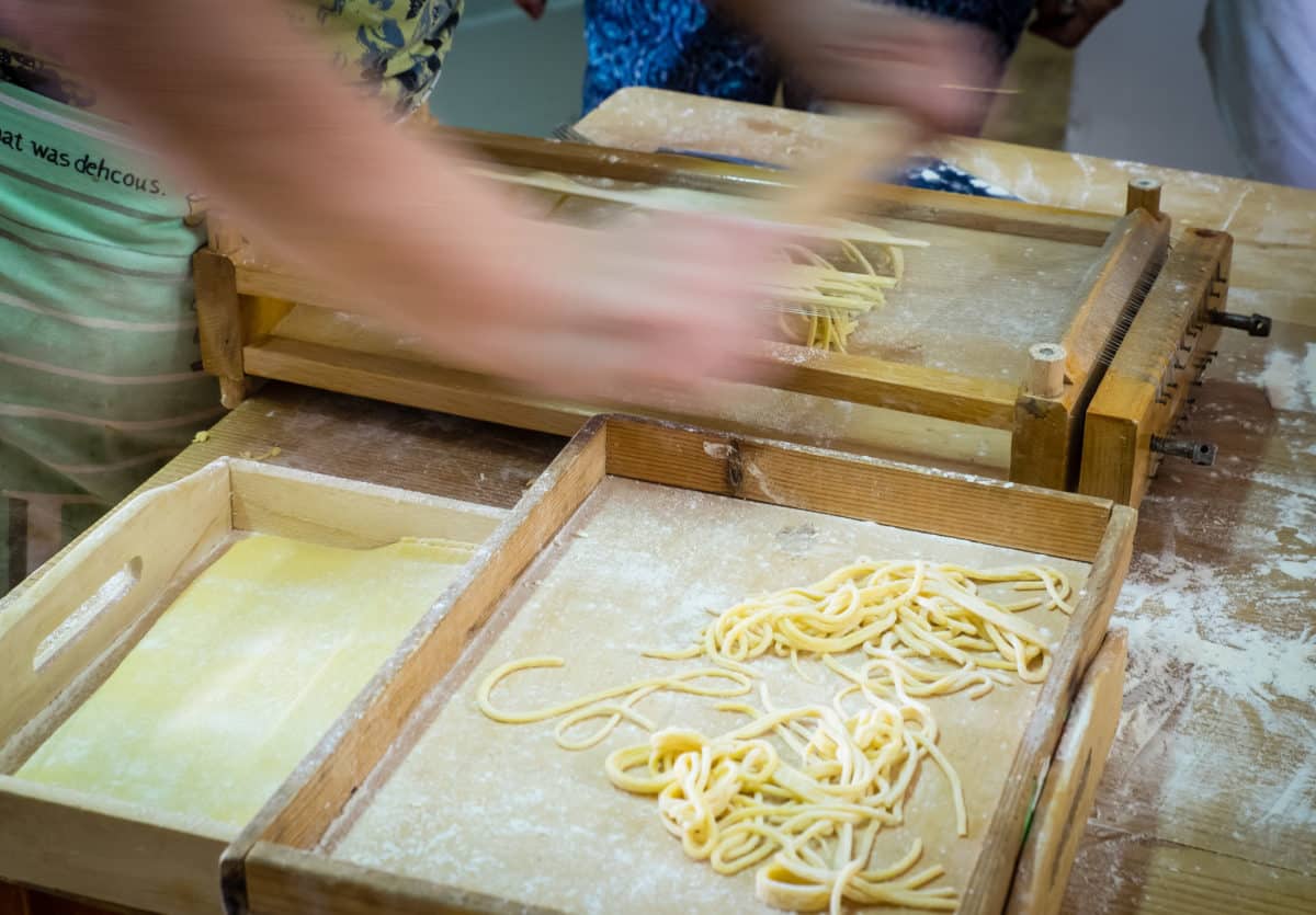 Later that evening, when we were ensconced in a sweet little restaurant, I wondered how I could possibly find the room or the will to eat after having had a home-cooked pasta banquet just a few hours before. Yet once we started to eat the simple, small servings of the regional food, especially savory little fried morsels of cheese souffle, I knew we were in the hands of another talented chef. We finished with small slices of rich cake, a family recipe from the chef’s mother.