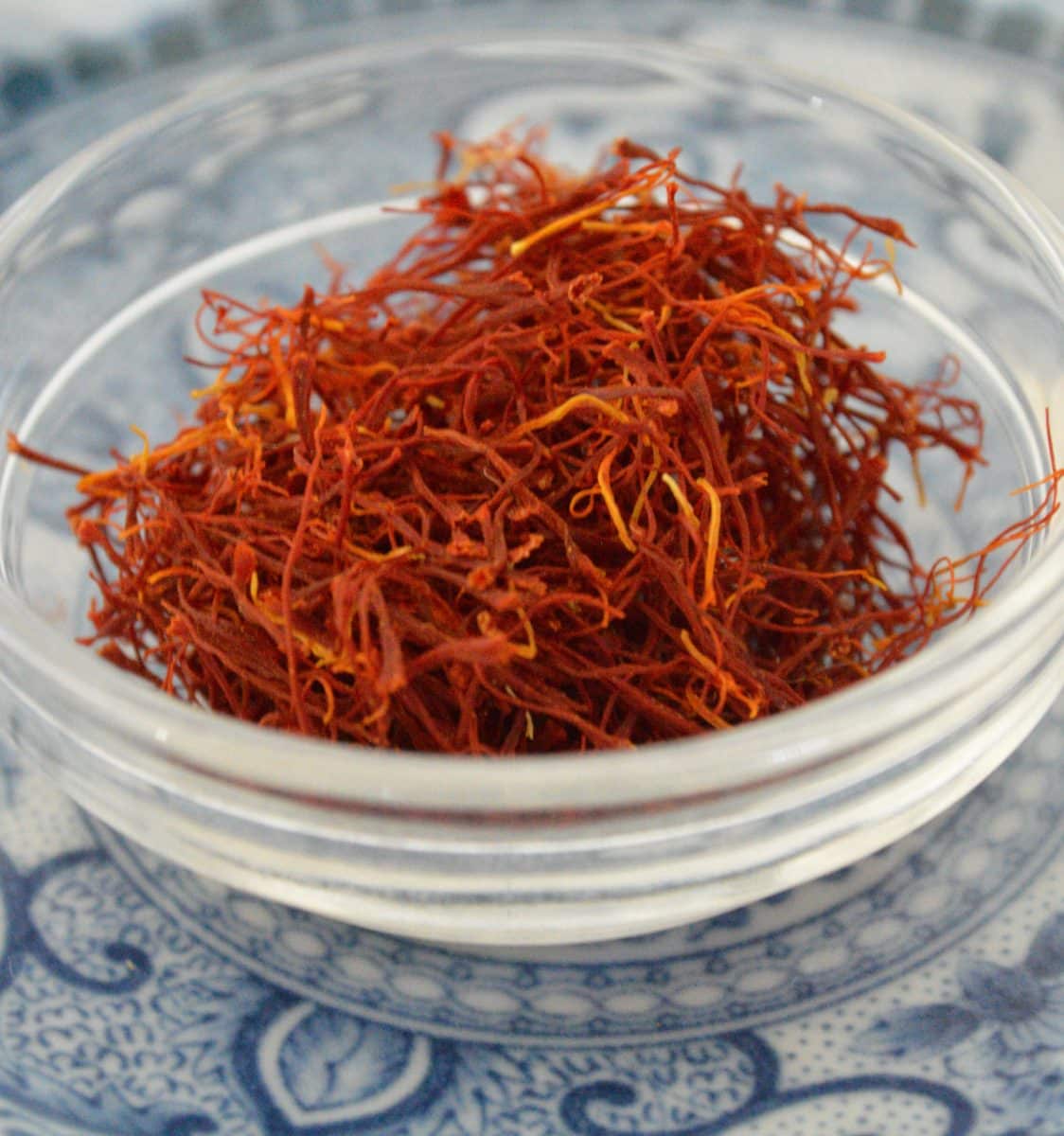 A glass bowl showcasing the vibrant and delicate saffron threads, a luxurious spice often used in cooking. Courtesy photo.