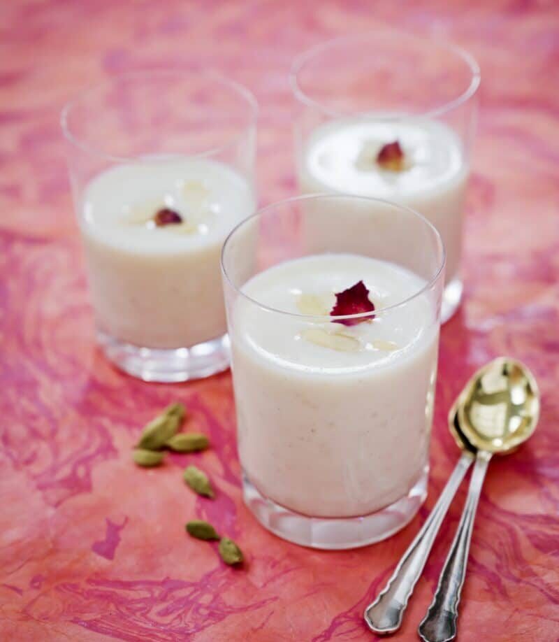 Serve in small glasses, garnished with sliced almonds and a few edible rose petals if you like.