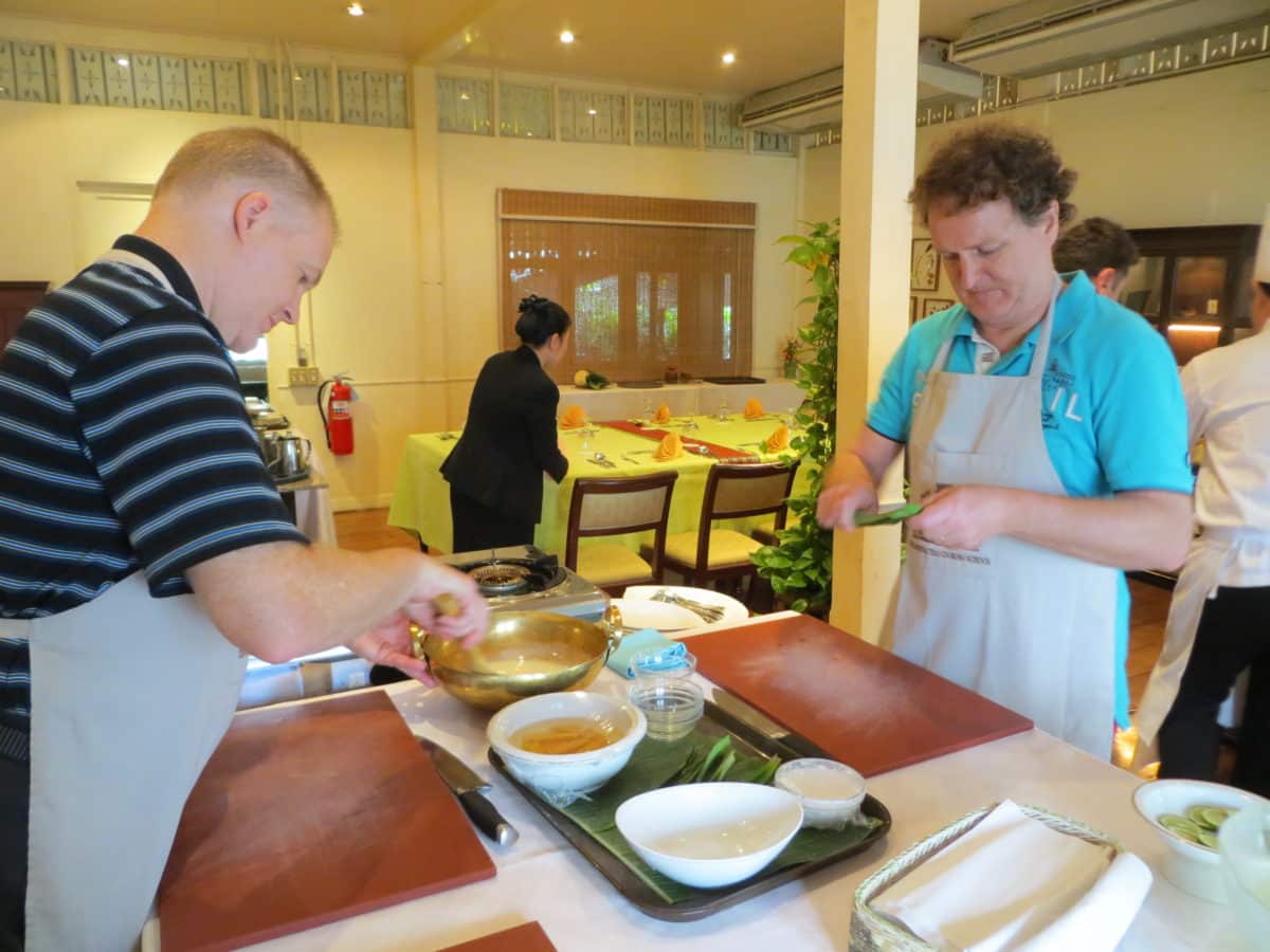 Chef Narain came to his cooking profession late in life. Brought up in a Chinese family, he worked for decades as an English teacher at one of the prestigious Thai universities until he decided on a career change. He attended a culinary apprenticeship program offered by the Oriental Hotel, graduated, and worked his way up to be one of their best cooking teachers. Assisted by staff members as well as the seven students during our three-hour morning class, he taught four recipes: stuffed cucumber soup; rice vermicelli with coconut cream sauce; fried baby shrimp encrusted with minced herbs, spices, and cashews; and sweet potato cooked in coconut sauce for dessert.