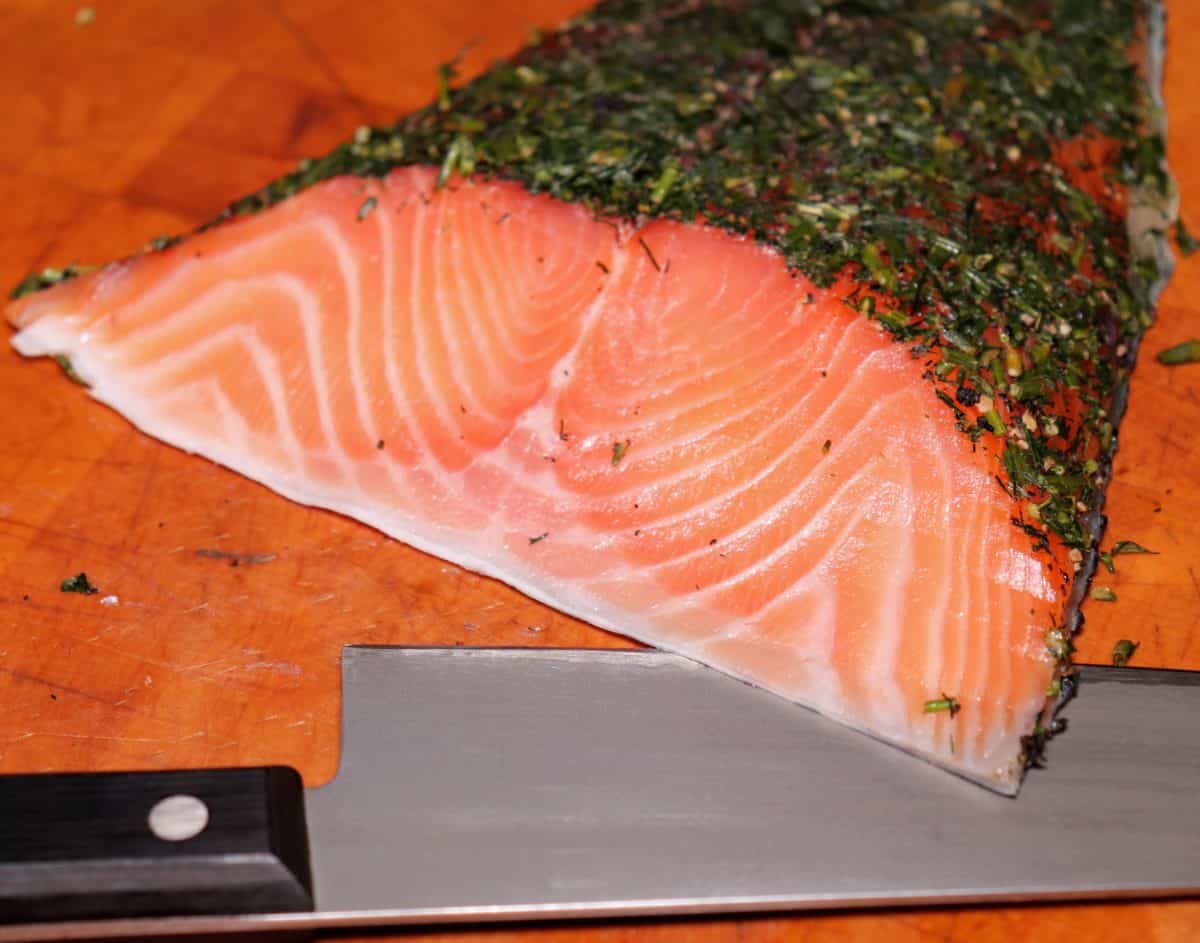 There’s much confusion in identifying the types of cured salmon. Often, they are all generically referred to as lox, which is unsmoked cured salmon belly. I make both gravlax and smoked salmon. Gravlax is simply cured salmon, typically flavored with dill. Smoked salmon is, as the name suggests, smoked after curing.
