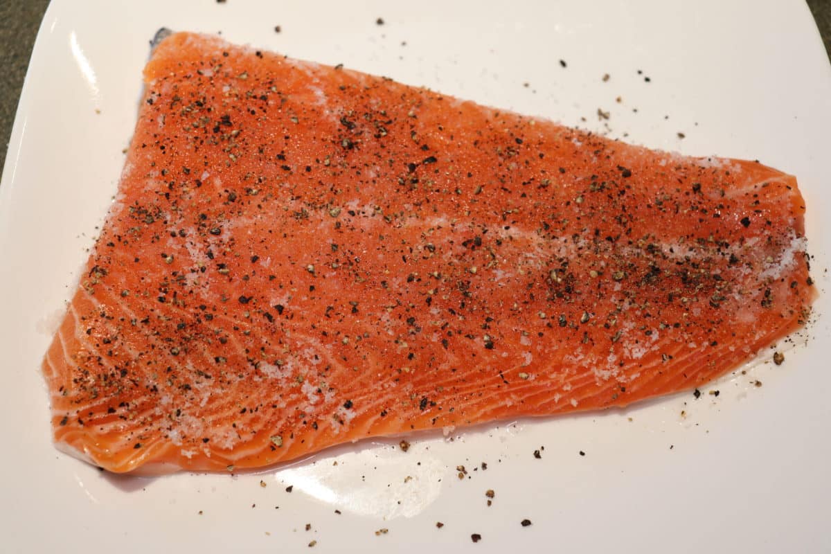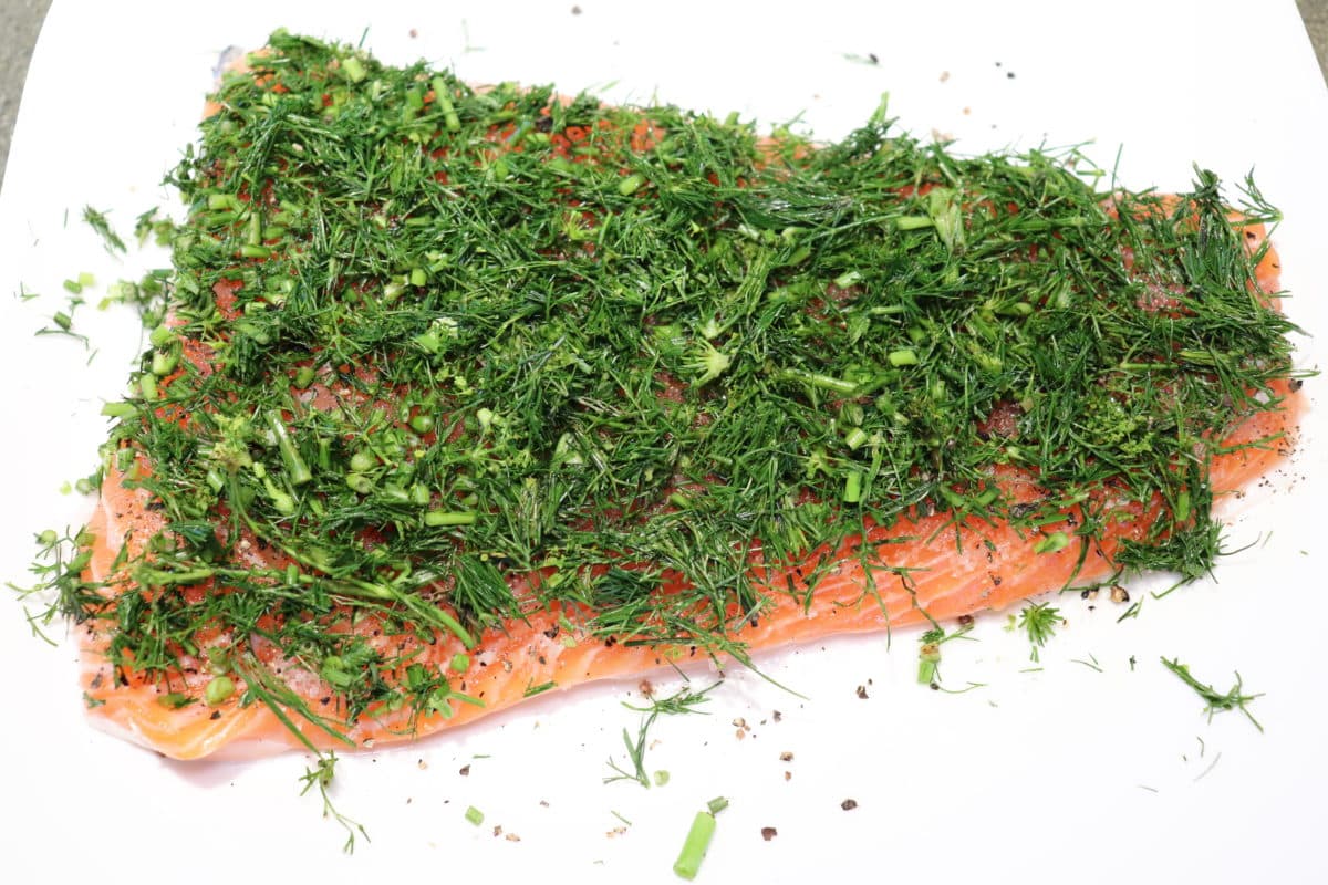 With the salt and sugar weighed out, mix them together and coat the flesh side of the salmon fillet. If the fillet is thicker in some parts, eyeball the cure to place more cure on the thickest parts of the fillet. Next, I apply other flavors. The most common is fresh dill. Finely chop enough to give a thick coating over the fillet. If you like — and I do like this — crack some freshly ground black pepper over the fillet before applying the dill.