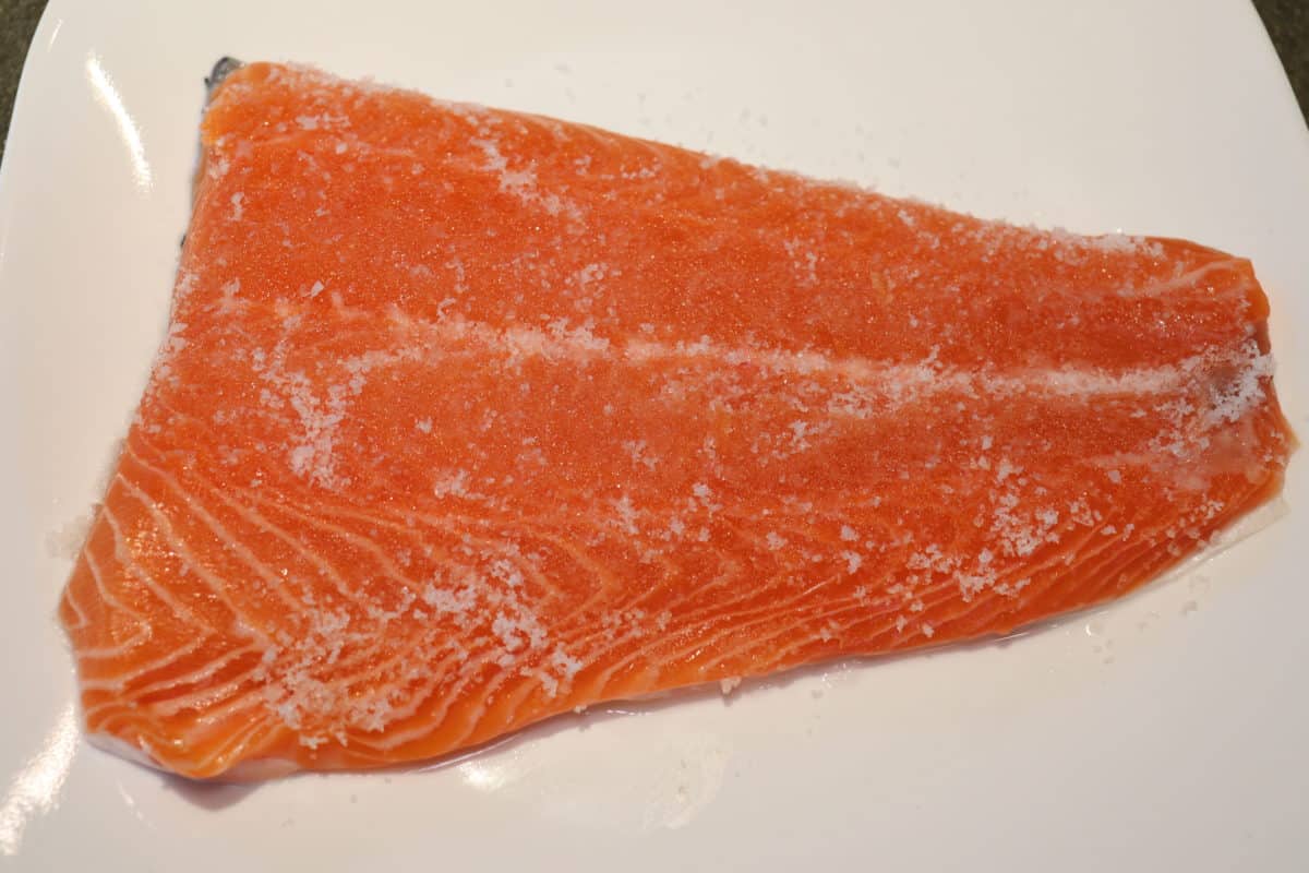 Use the best and freshest salmon you can find. We live near a Korean grocery store that has an active sushi business, so they always have fresh salmon. Since this is so easy to make, I generally purchase about a pound of salmon to cure. I am looking for a fish that was just cleaned, there should be no tears in the flesh, an indication that it has been sitting for a day or so and has begun to break down. I prefer to leave the skin on and then leave it behind when slicing the finished product.