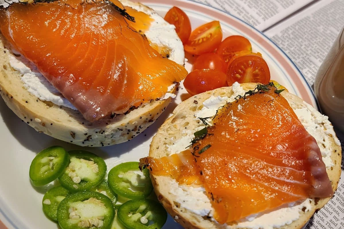 I’ve always heard that breakfast is the most important meal of the day. I’m not sold on this, but having spent years on the road, I learned to grab more than a cup of coffee in the morning at the airport. That little bag of airplane pretzels was never going to cut it. A decent breakfast that is widely available and quite portable is a bagel with smoked salmon. Eventually this breakfast became a habit for me, and I knew where to find a passable bagel and salmon. Transporting this habit home, my most common breakfast these days is either a lightly toasted bagel or a slice of freshly baked sourdough bread topped with some homemade lactic cheese, a couple slices of homemade gravlax or smoked salmon, and thin slices of fresh jalapeno pepper.
