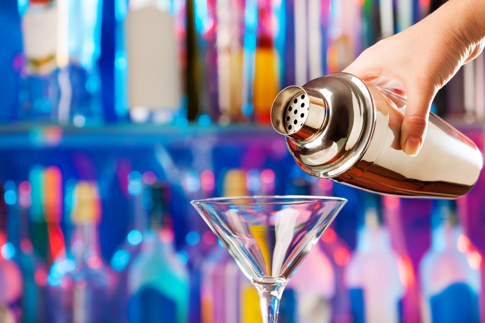 A skilled barman pouring a refreshing drink from a shaker into a glass, highlighting the colors of the liquors in the background.