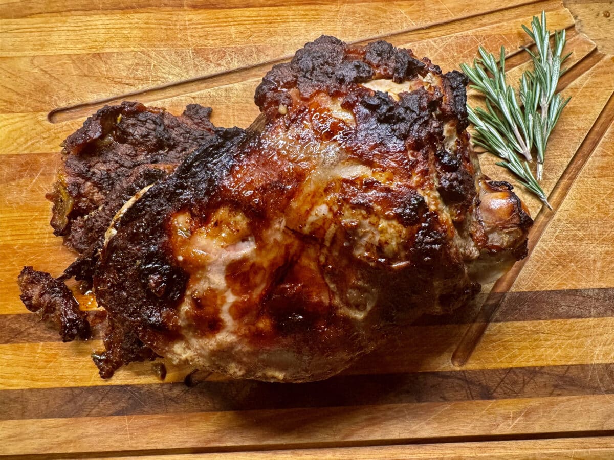 Sweet Crusted Leg of Lamb is a lovely – and very easy – recipe for a holiday dinner. The semi-boneless leg of lamb is roasted with a coating of breadcrumbs, orange marmalade or preserves, and mustard, resulting in lamb that is moist, tender, and flavorful. When choosing the marmalade, take a look at the sugar content. Products high in sugar, as marmalade tends to be, may burn. Low-sugar orange preserves are less sweet and still full of flavor. If you find that the coating is starting to burn, cover the roast with foil and remove it toward the end of cooking.