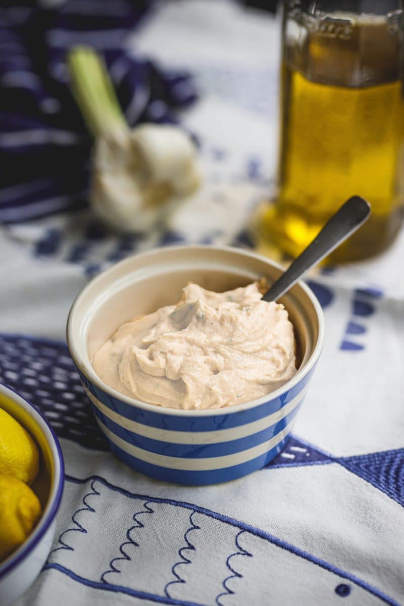 Aioli is a versatile condiment popular in Mediterranean cuisine. The sauce made from garlic (a lot of it) and olive oil and salt. It is similar to mayonnaise, but that is typically made with canola oil and egg yolks.