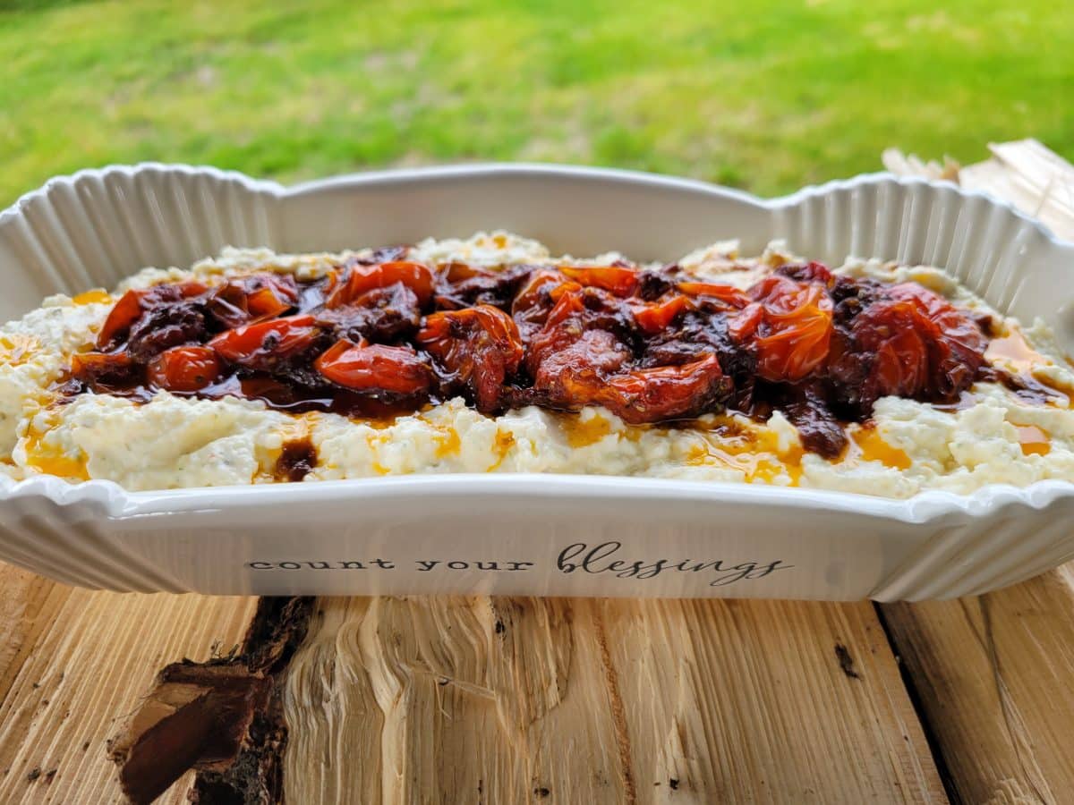 This recipe for whipped feta with roasted tomatoes brings whipped feta to a whole new level. Not simply roasted, the tomatoes are seasoned and marinated. Serve whipped feta with roasted tomatoes at your next party as a dip with crusty bread slices, crackers, or pita bread, toasted or plain.