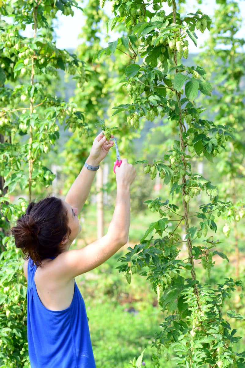 Hops are harvested in late August and early September, once the moisture level in the cones begins to drop. Historically, hops were harvested by hand. Scores of people would migrate from the cities to the countryside, staying in camps during the harvest, plucking the cones from the bines and being paid by the pound. For the backyard hop grower hand picking is still the way to go, but today’s commercial growers use a mechanized process, cutting the bines and feeding them through a machine that strips them of their cones.
