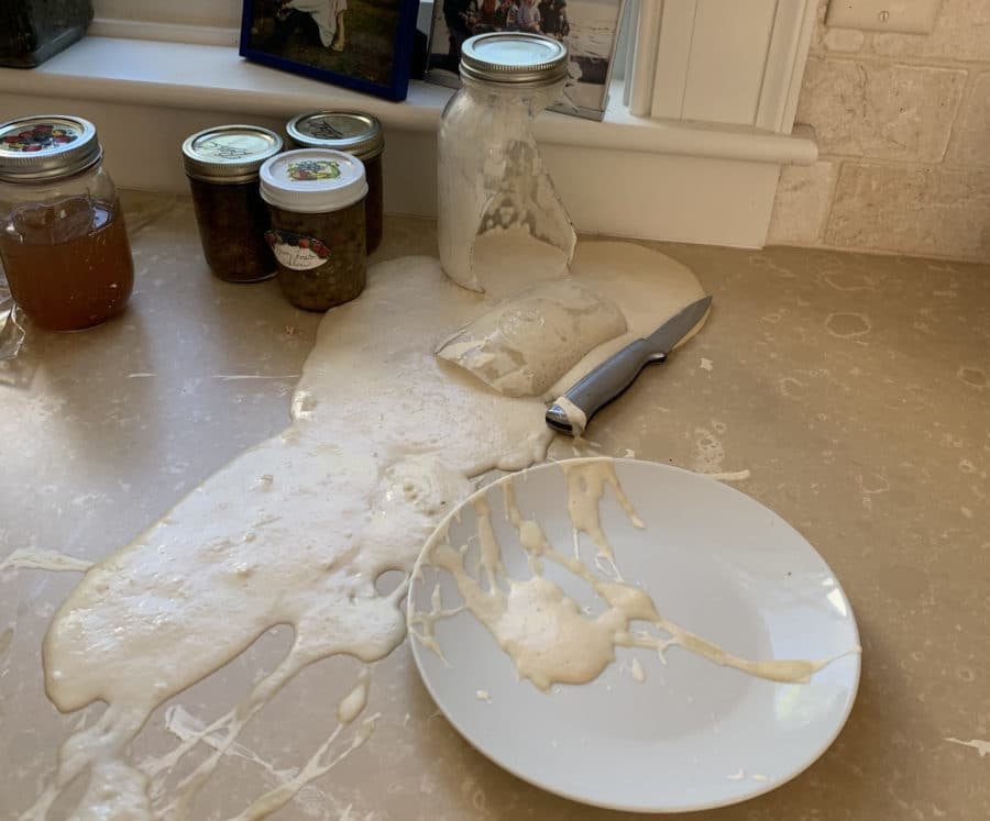 Should you choose to accept the mission of keeping a living breathing creature in your cupboards, it doesn’t have to be an all consuming affair. If you don’t feel like caring for your needy starter, you can just place it in your fridge and put your child to bed. The jar will sulk and sleep in the back of your refrigerator until the day arises that you feel the urge to mix and wait and smell the earthy aroma of starter doing its thing, creating bubbles of yeasty goodness growing in its home. Another benefit to feeding your starter is how quickly and easily it reproduces, it can then be shared, just pour ½ of the bubbly mixture into another jar, cover with a mason jar lid and gently offer it up to an unsuspecting quarantined friend. A labor of love like sourdough starter is meant to be shared.  Although sourdough is sour in flavor and it certainly can be a sour process to make, after all the hard work and effort and failed attempts, that first bite of fresh-out-of-the-oven bread and the warmth and heavenly smell in the kitchen makes a house a home. It makes a stay-at-home order a little easier to bear.